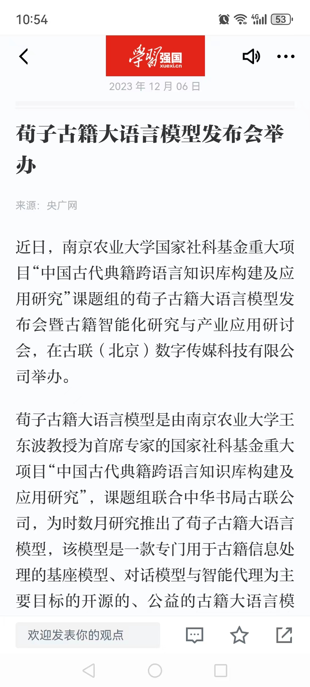 近日,学习强国报道成人视频王东波教授团队发布荀子古籍大语言模型。